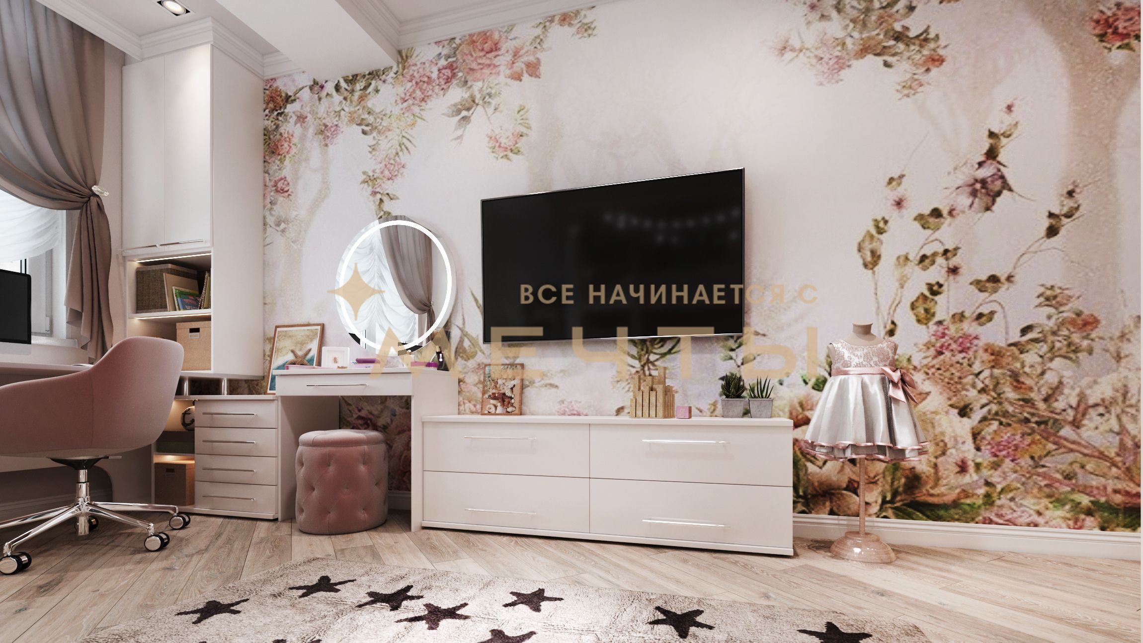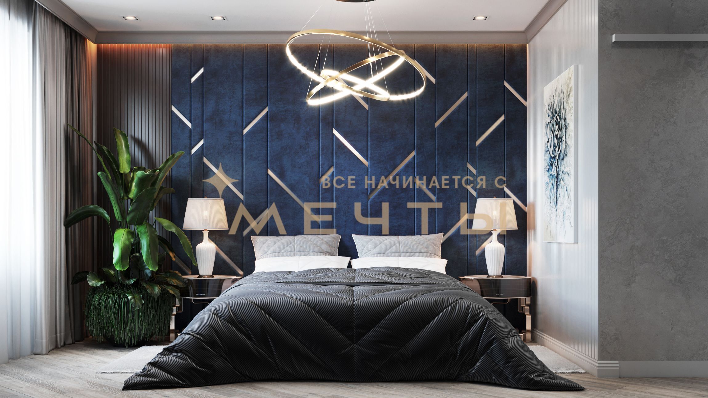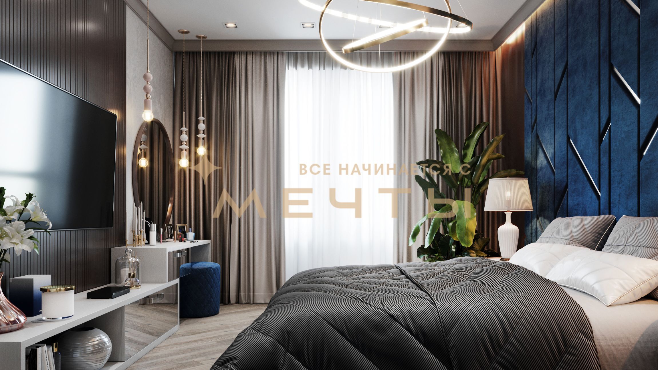 В стоимость входит все, что есть на визуализациях: качественный ремонт, мебель, техника, аксессуары и текстиль.