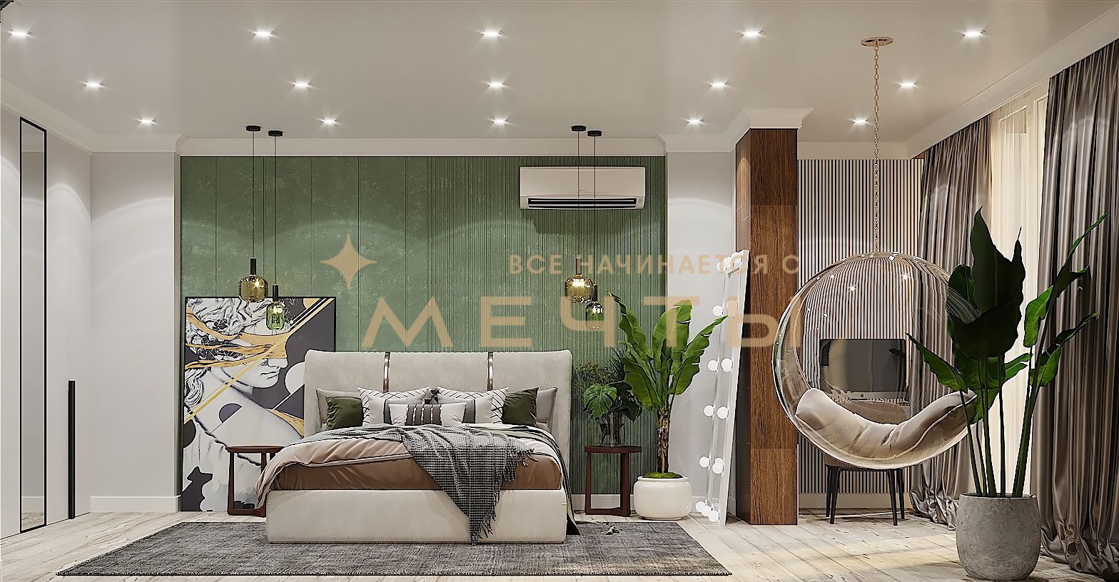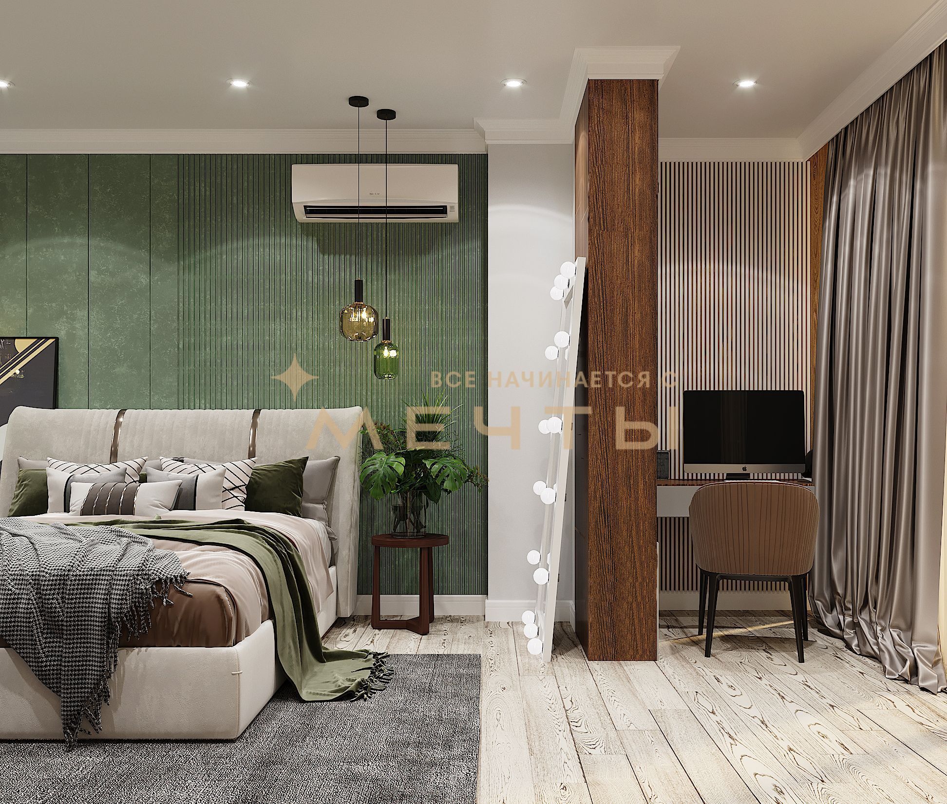 В стоимость входит все, что есть на визуализациях: качественный ремонт, мебель, техника, аксессуары и текстиль.