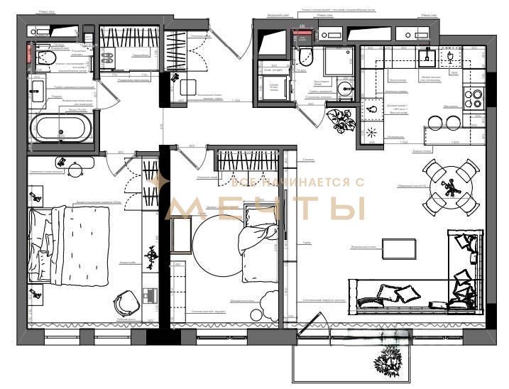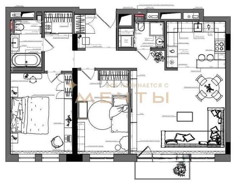 Квартира продается с разработанным дизайн-проектом и ремонтом. В стоимость входит все, что есть на визуализациях: качественный ремонт, мебель, техника, аксессуары и текстиль. Возможно внесение изменений по вашим пожеланиям.