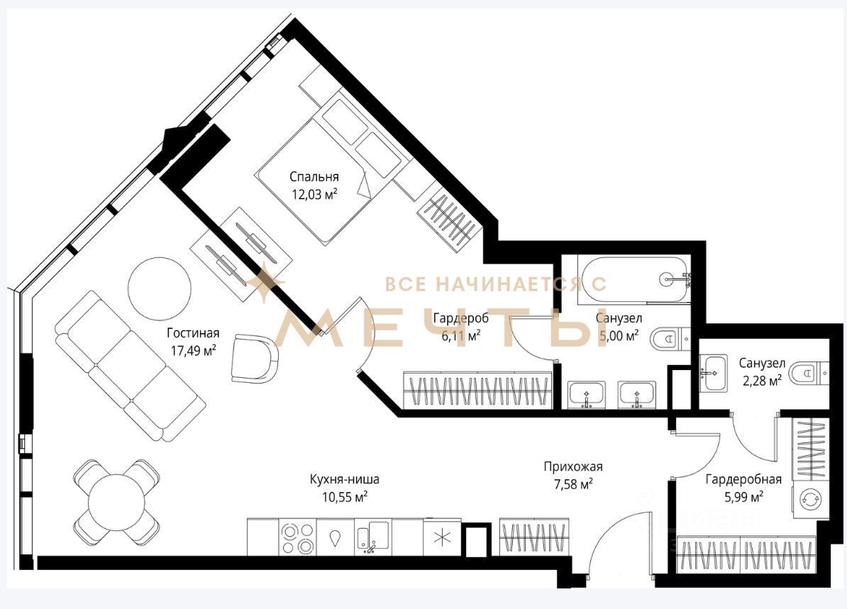 Квартира продается с разработанным дизайн-проектом и ремонтом. В стоимость входит все, что есть на визуализациях: качественный ремонт, мебель, техника, аксессуары и текстиль. Возможно внесение изменений по вашим пожеланиям.
