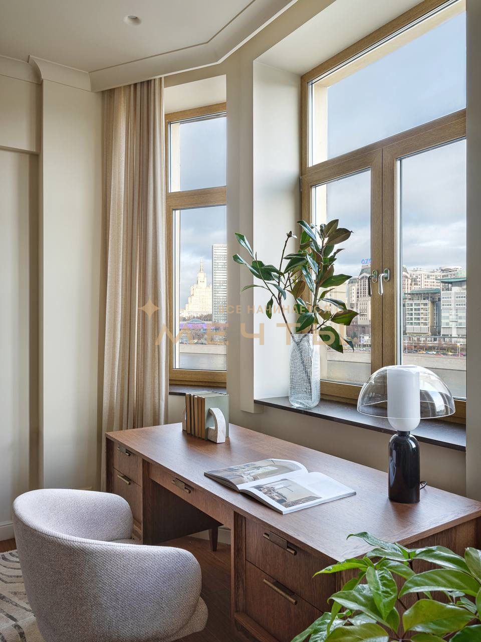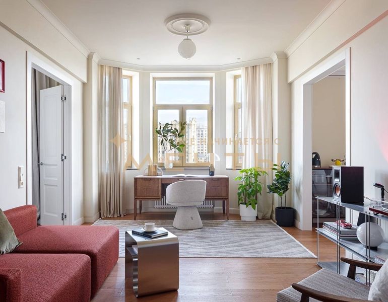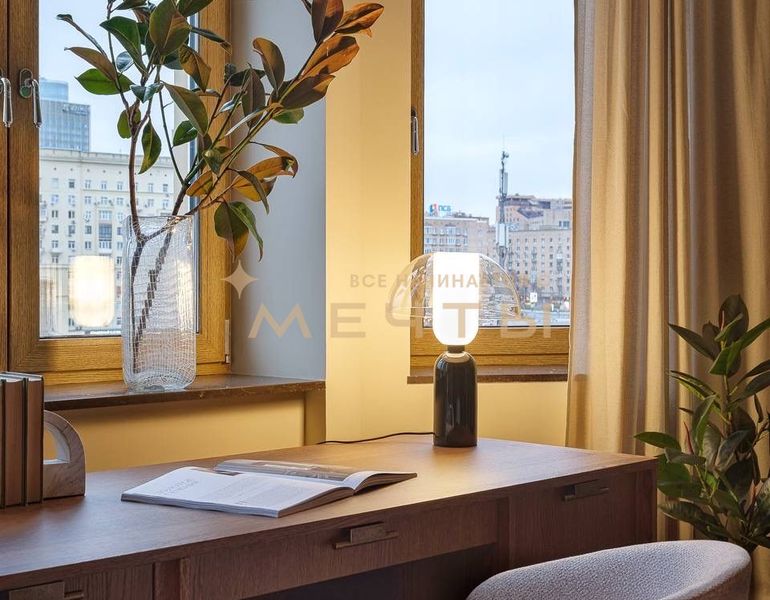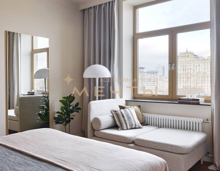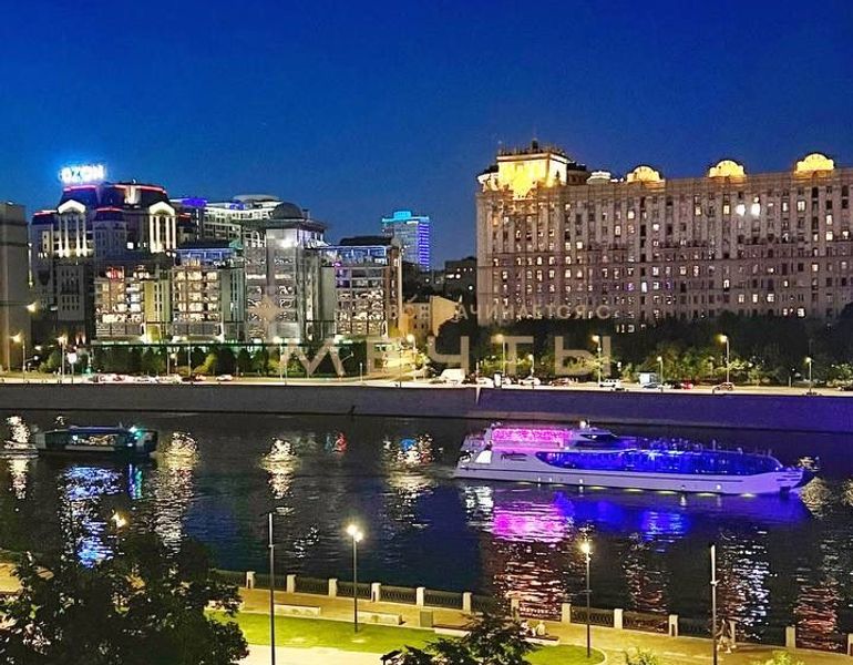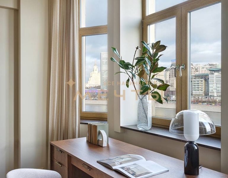 Предлагается дизайнерская квартира в центре Москвы с видом на реку и комплекс “Москва-Сити”. Квартира расположена на 30 этаже и включает кухню-гостиную, детскую комнату, две ванные комнаты, гардеробную, а также мастер-спальню с собственным санузлом и шикарной гардеробной площадью 13 м². Дизайн интерьера выполнен в спокойном классическом стиле с использованием натуральных материалов — камня и дерева. Во всех помещениях установлены разнообразные подсветки, люстры, точечные светильники и бра, что создает атмосферу уюта. Большое количество окон наполняет квартиру естественным светом.