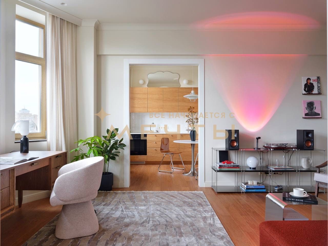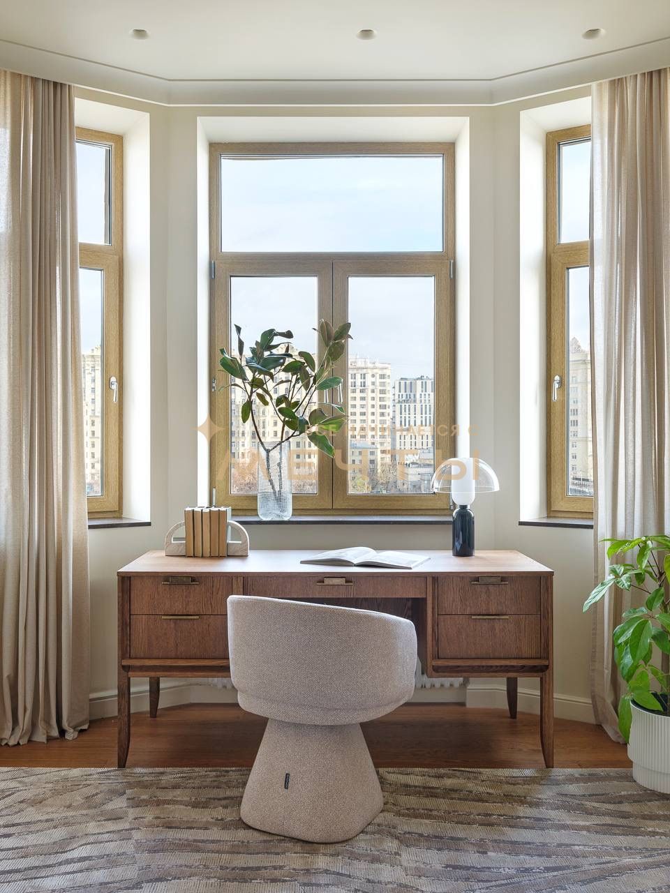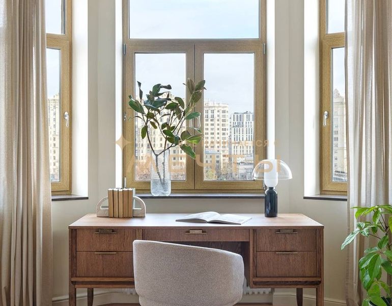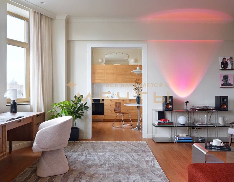 Предлагается дизайнерская квартира в центре Москвы с видом на реку и комплекс “Москва-Сити”. Квартира расположена на 30 этаже и включает кухню-гостиную, детскую комнату, две ванные комнаты, гардеробную, а также мастер-спальню с собственным санузлом и шикарной гардеробной площадью 13 м². Дизайн интерьера выполнен в спокойном классическом стиле с использованием натуральных материалов — камня и дерева. Во всех помещениях установлены разнообразные подсветки, люстры, точечные светильники и бра, что создает атмосферу уюта. Большое количество окон наполняет квартиру естественным светом.