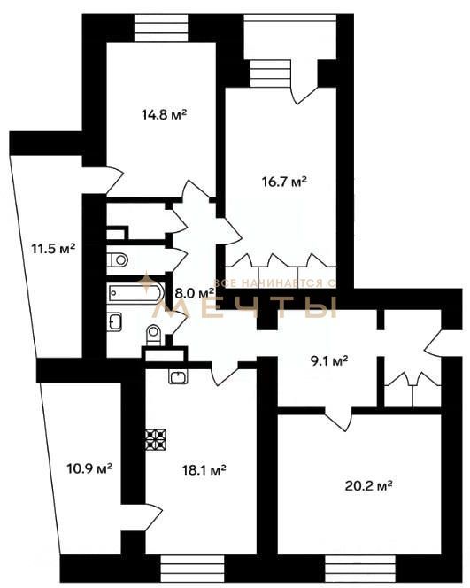 Общая площадь: 184,55 кв.м, комнаты изoлиpованные.