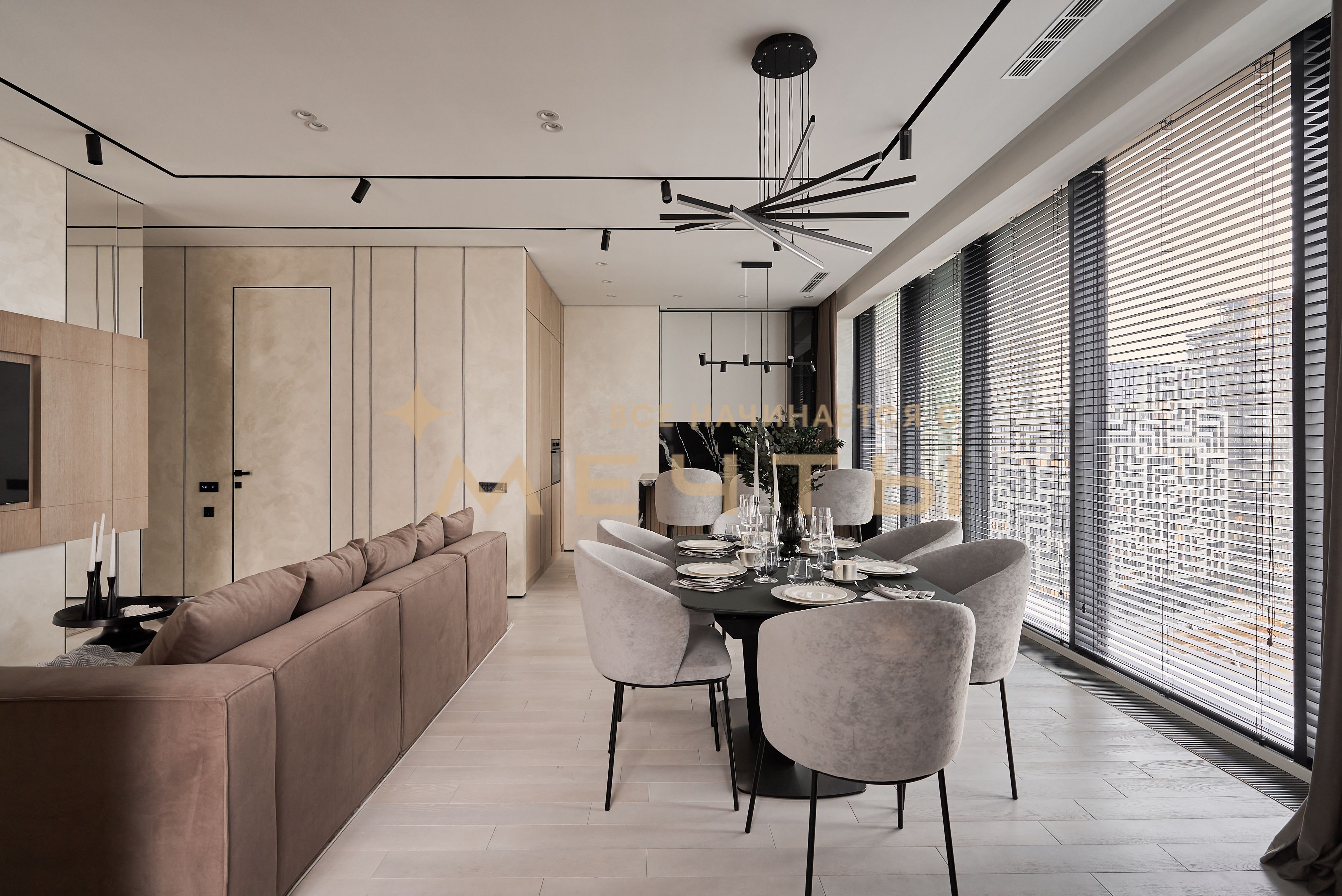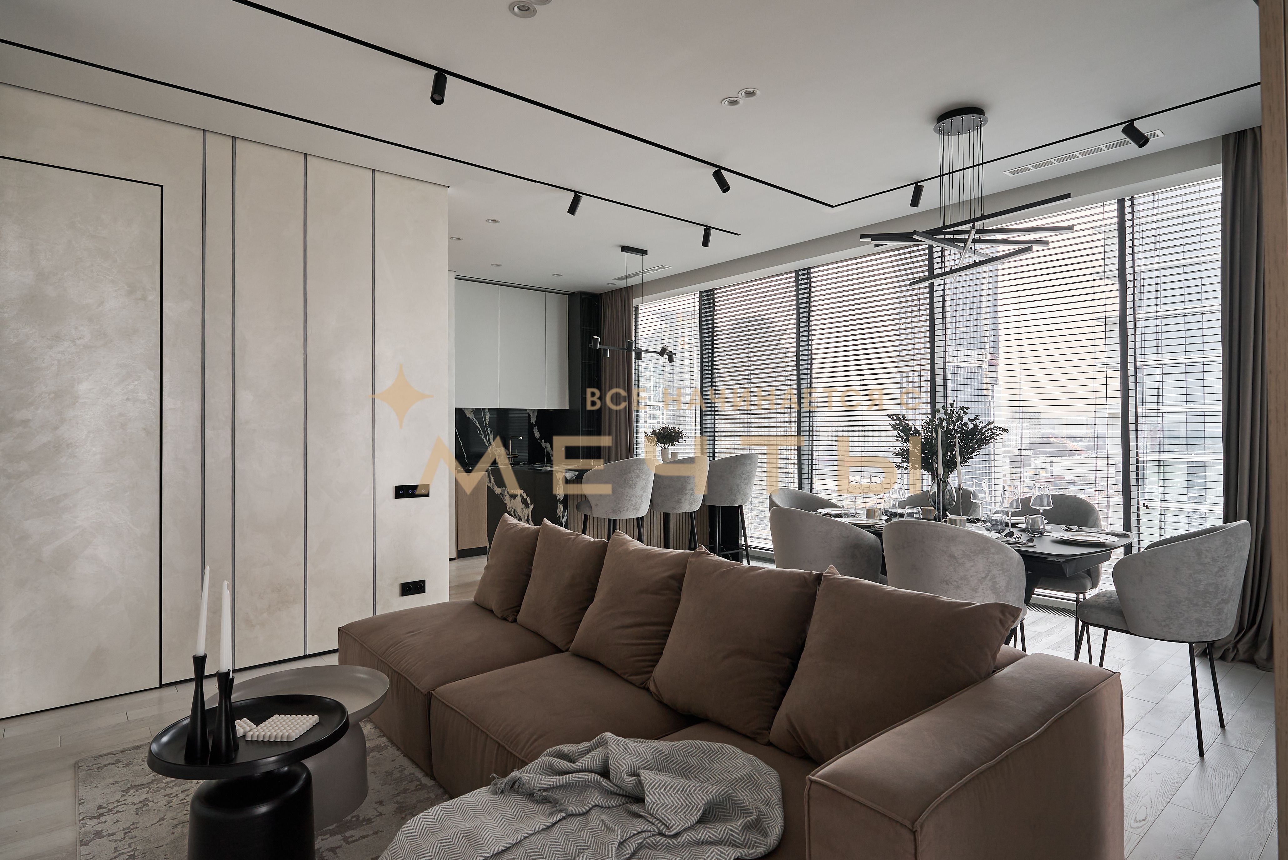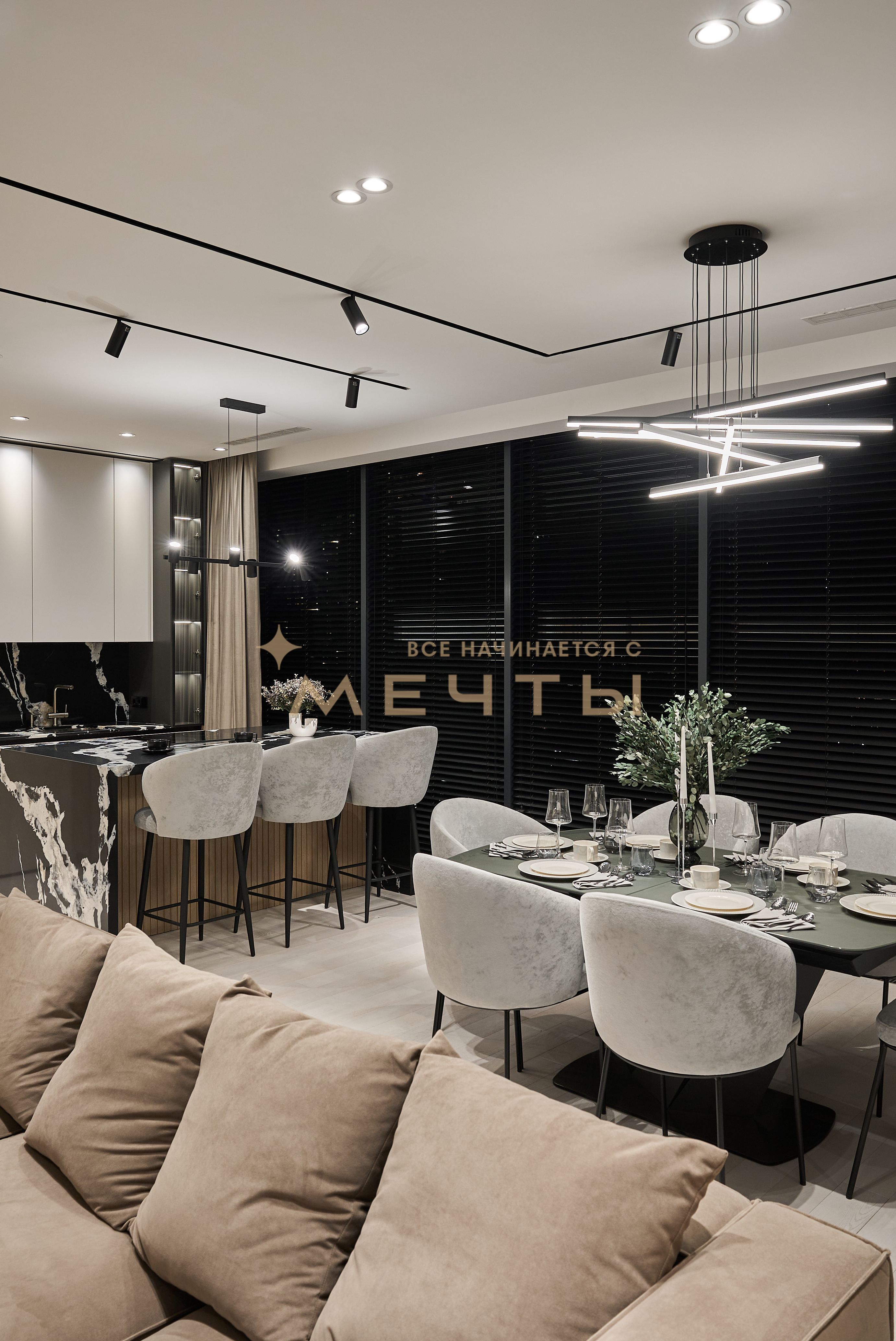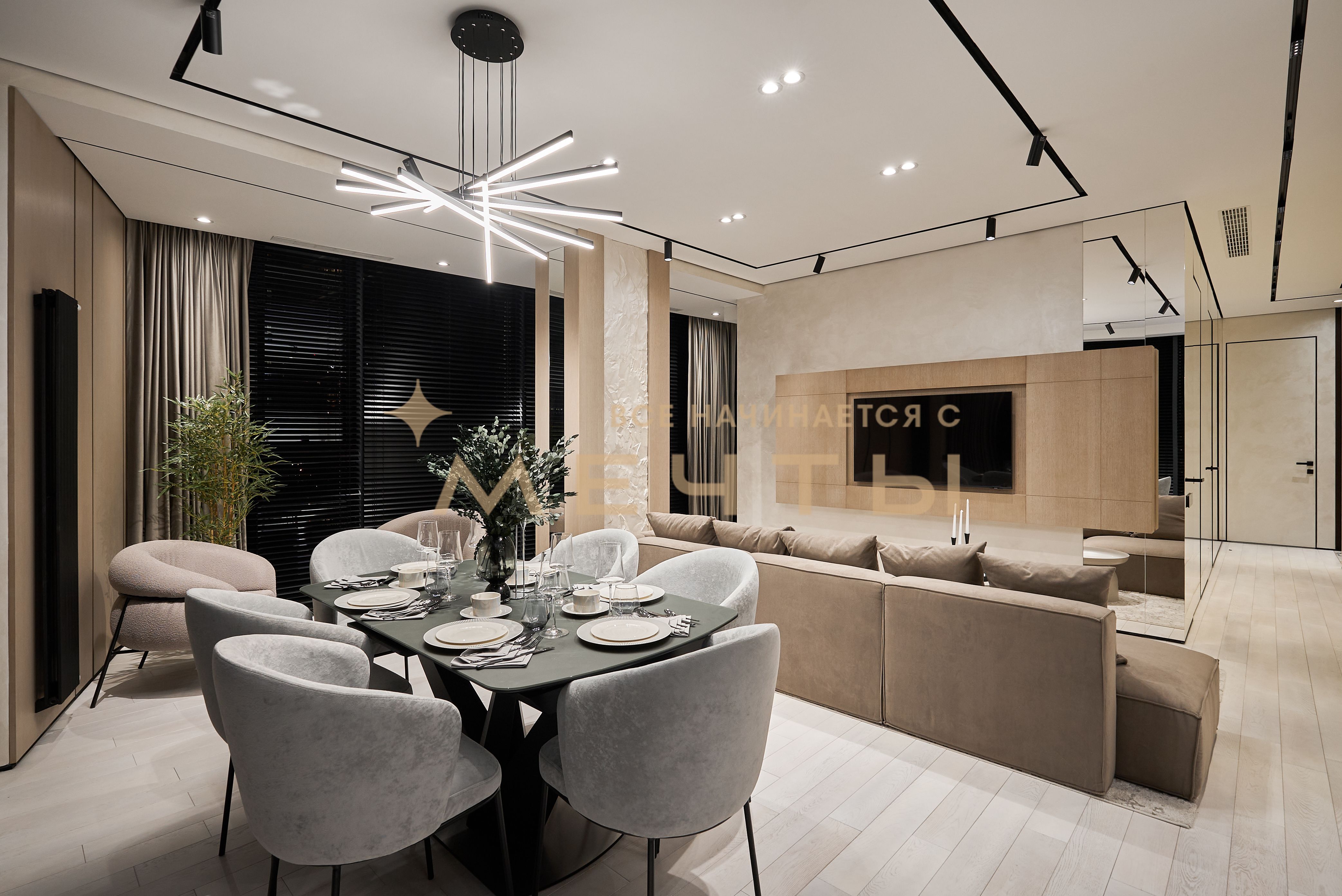 Евро-трехкомнатная квартира с дизайнерским ремонтом в стиле современная классика. Кухня-гостиная оснащена премиальной техникой: варочной панелью, духовым шкафом с функцией СВЧ, посудомоечной машиной, холодильником, винным шкафом, измельчителем пищевых отходов, фильтром для воды и домашним кинотеатром. Две изолированные спальни с выходом на лоджии, из панорамных окон которых открываются великолепные виды на город и парк “Событие”. Два совмещенных санузла с ванной и душевой кабиной. Также имеется хозяйственный блок и центральная система кондиционирования. В стоимость входит всё, что представлено на фото: качественный ремонт, мебель, техника, аксессуары и текстиль.